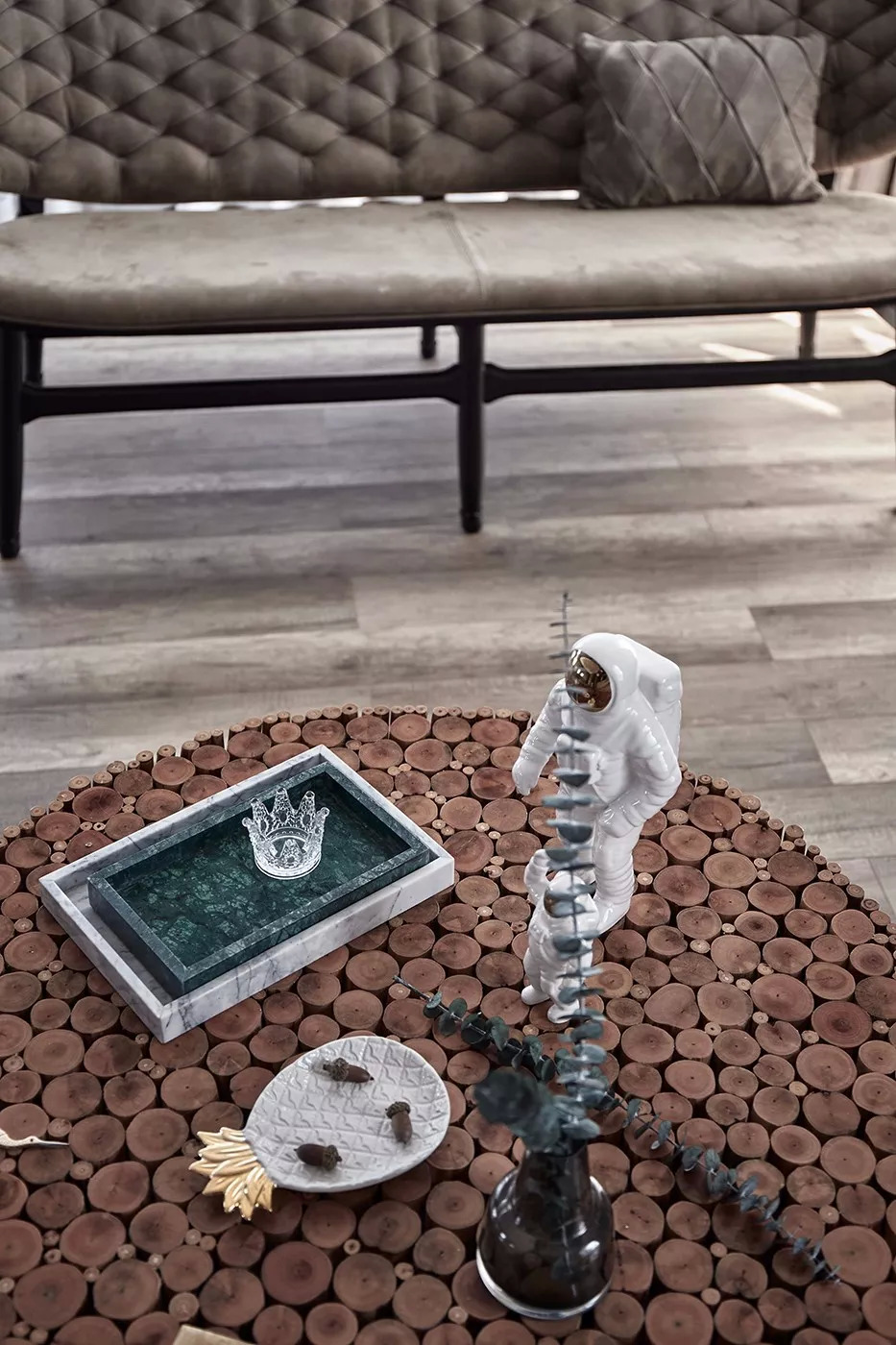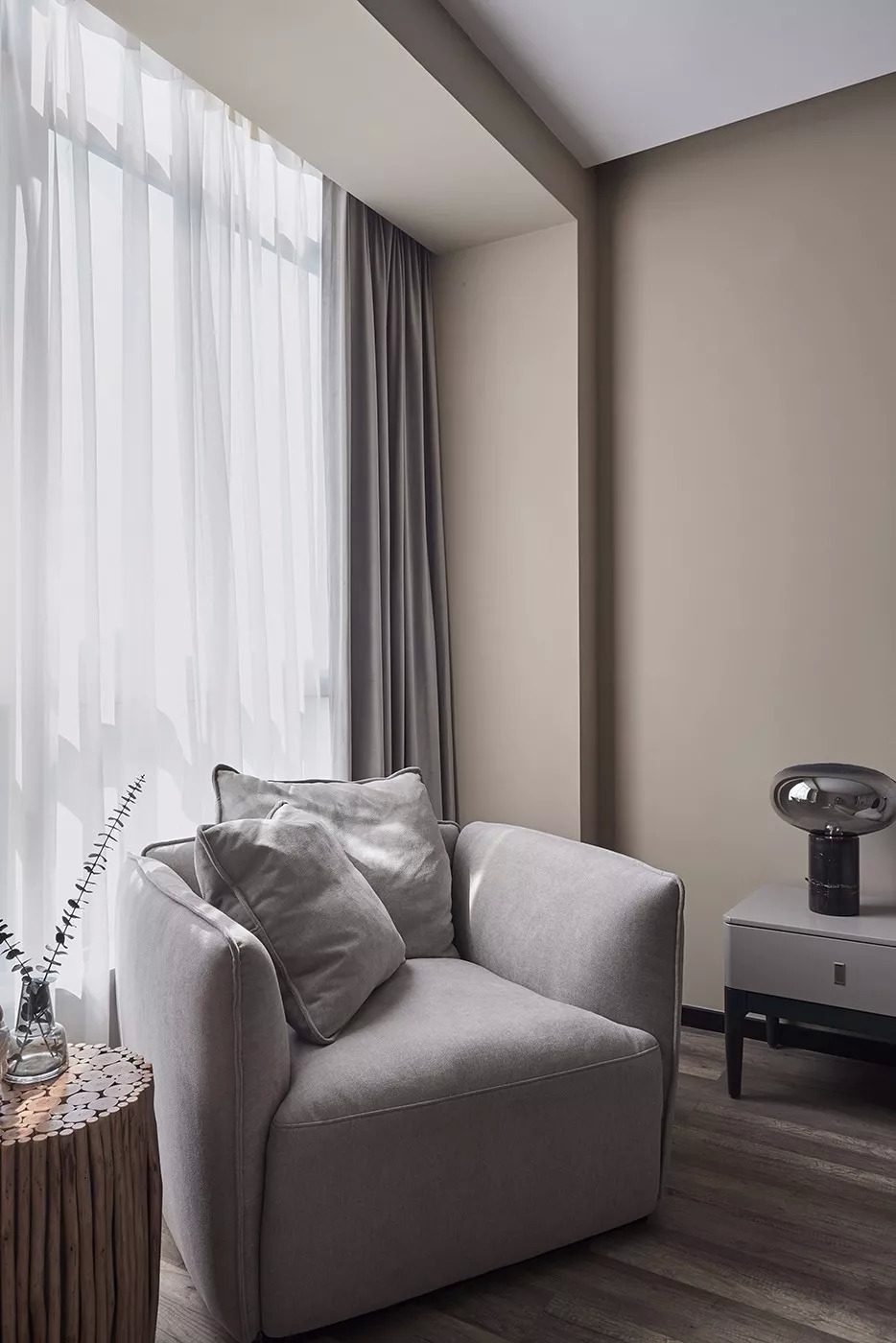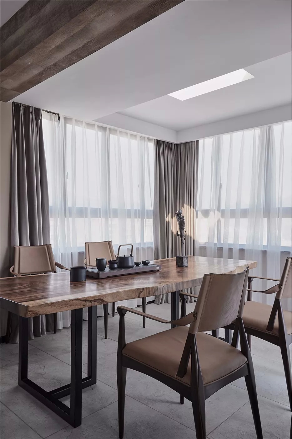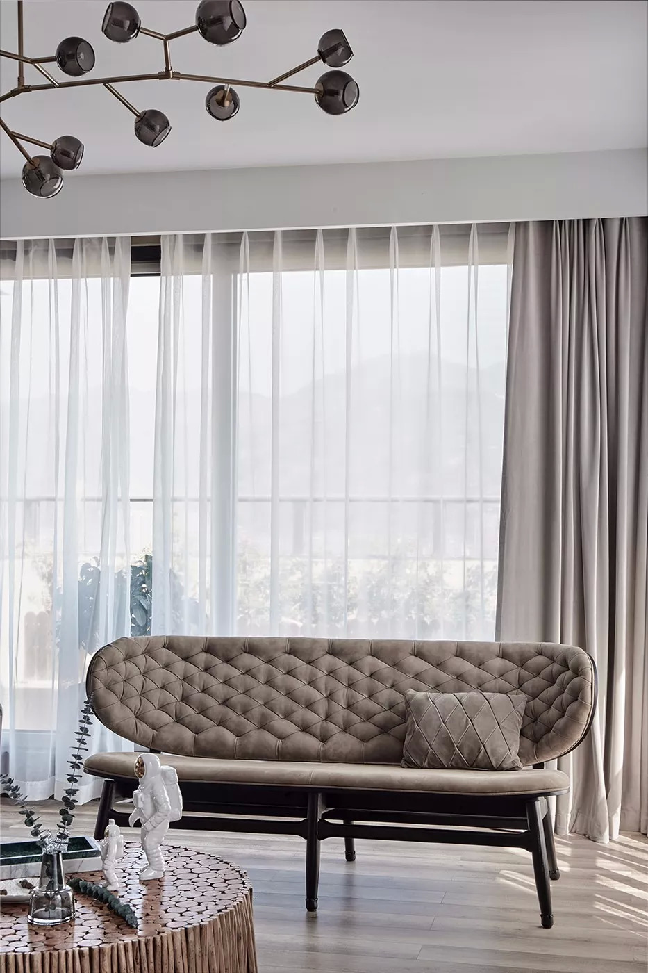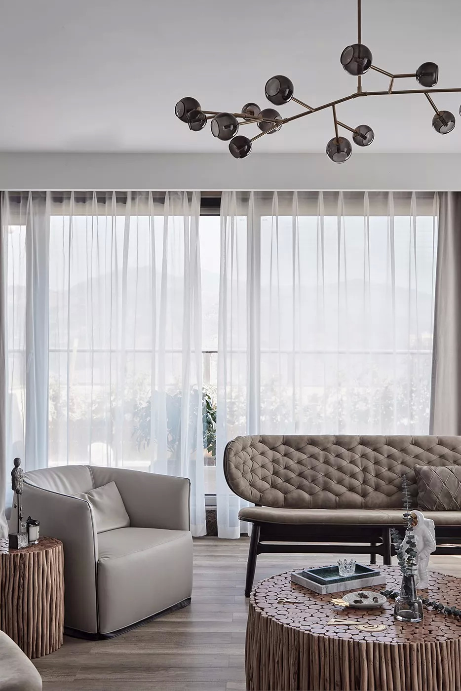 客厅的格局以简约黑白灰为主,冷色穿插,做旧的木桩家具,与地板相呼应。加上充满现代感的灯具点缀,整个空间高冷又不失温馨。简约、自然,没有繁复的装饰,通过大理石优美的纹理和细腻的饰面让空间变得更加精致和有层次感。而实木的融入,让大理石多了几分朴素温暖的韵味,两种材质的完美融合,将功能与美学转化为精致的细节,赋予其刚柔并济的空间氛围。