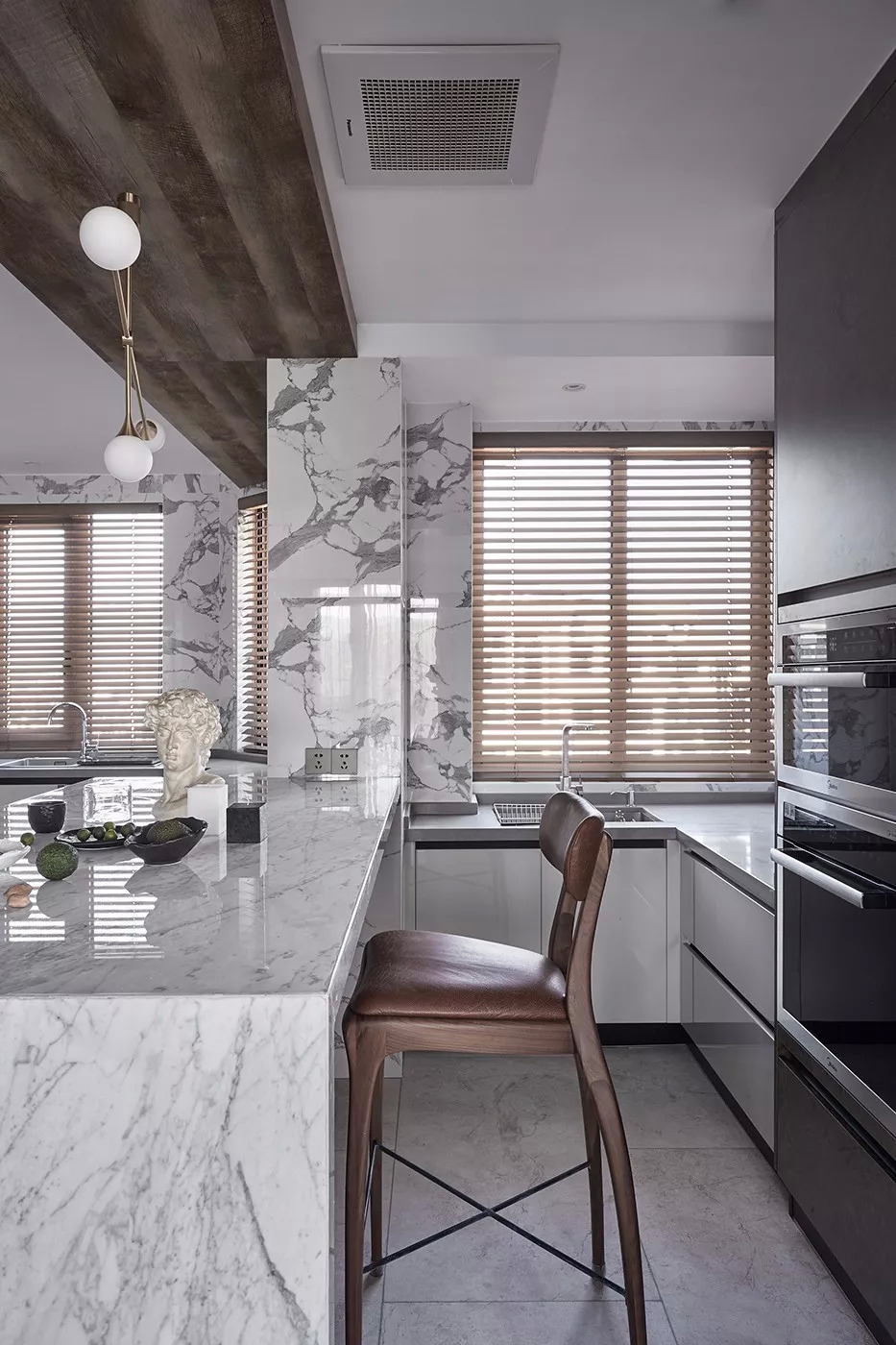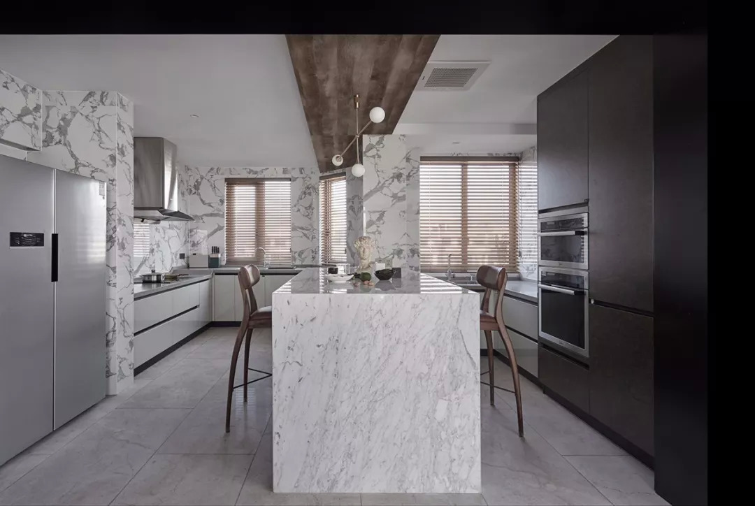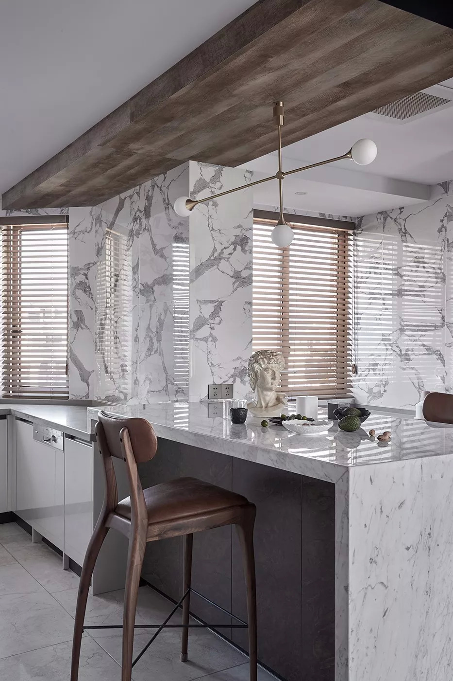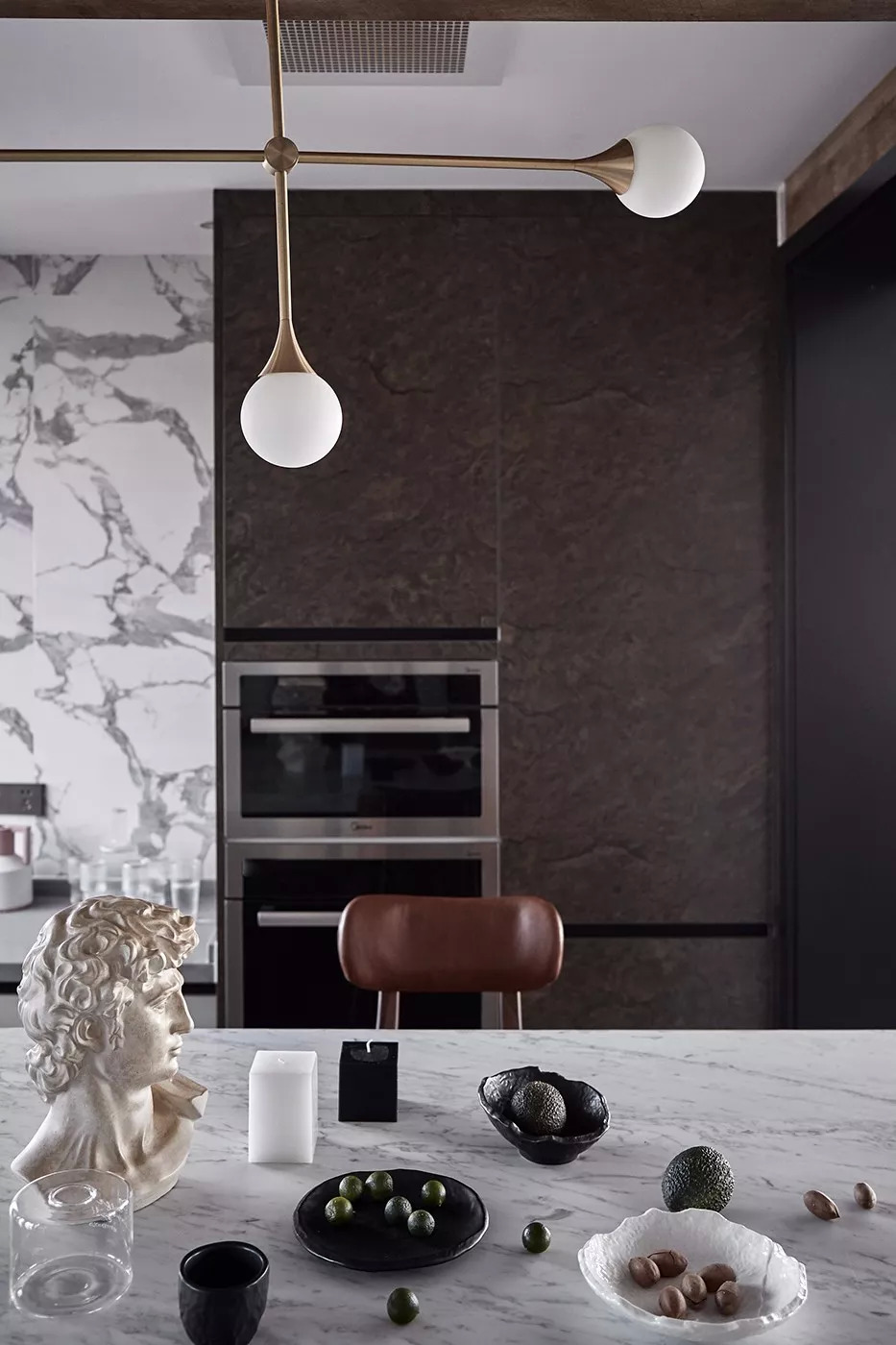 空间中大理石有着水墨一样的纹理色调,既丰富了空间格调,又留下雅致的留白,点点肌理具有流动生命力,给空间带来无尽想象的自然美感。它温润而自然,低调而内敛,看似清冷的姿态,却流露出时尚奢华的质感。有石则雅,有石则贵。