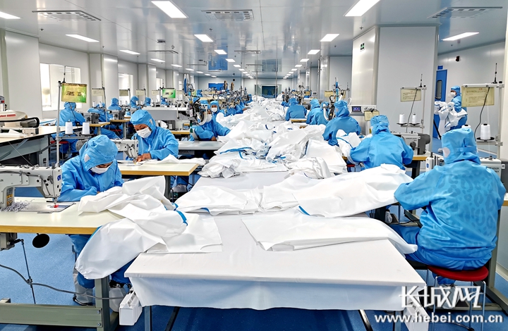 在防护服生产线上,一个个身着蓝色工装的工人,宛如一只只可爱的“蓝精灵”。