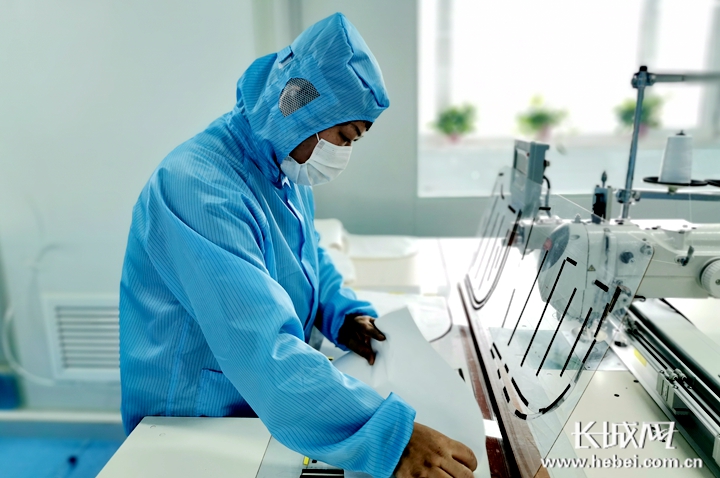 “这是我们的蓝色防静电洁净服。”际华三五零二副总经理张素英介绍,每一个进入车间的操作工人要统一穿戴防静电工作服、口罩和防护脚套,并经过严格的洗手、消毒程序。