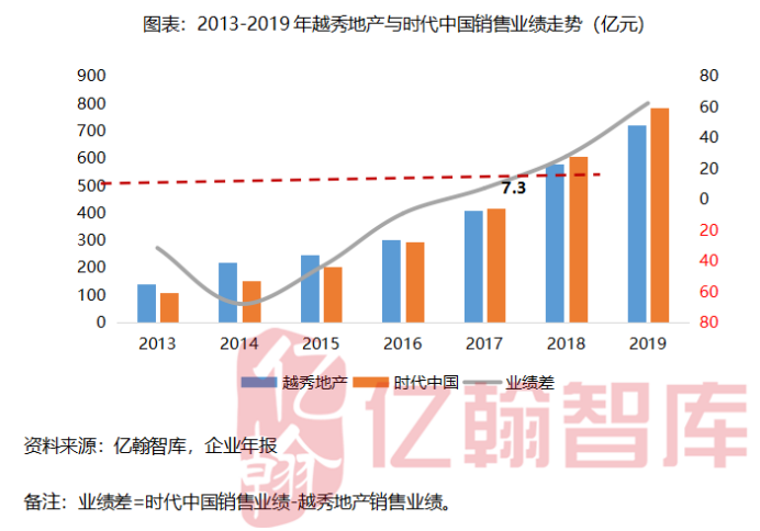 2019年,时代中国实现合同销售额783.6亿元,同比增长29.3%。同期,越秀地产录得合同销售金额约721.1亿元,同比增长25%。