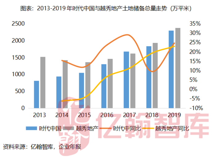 土地储备是房企实现千亿销售额的基础。相较于时代中国,越秀地产在土地储备上的优势正不断扩大。