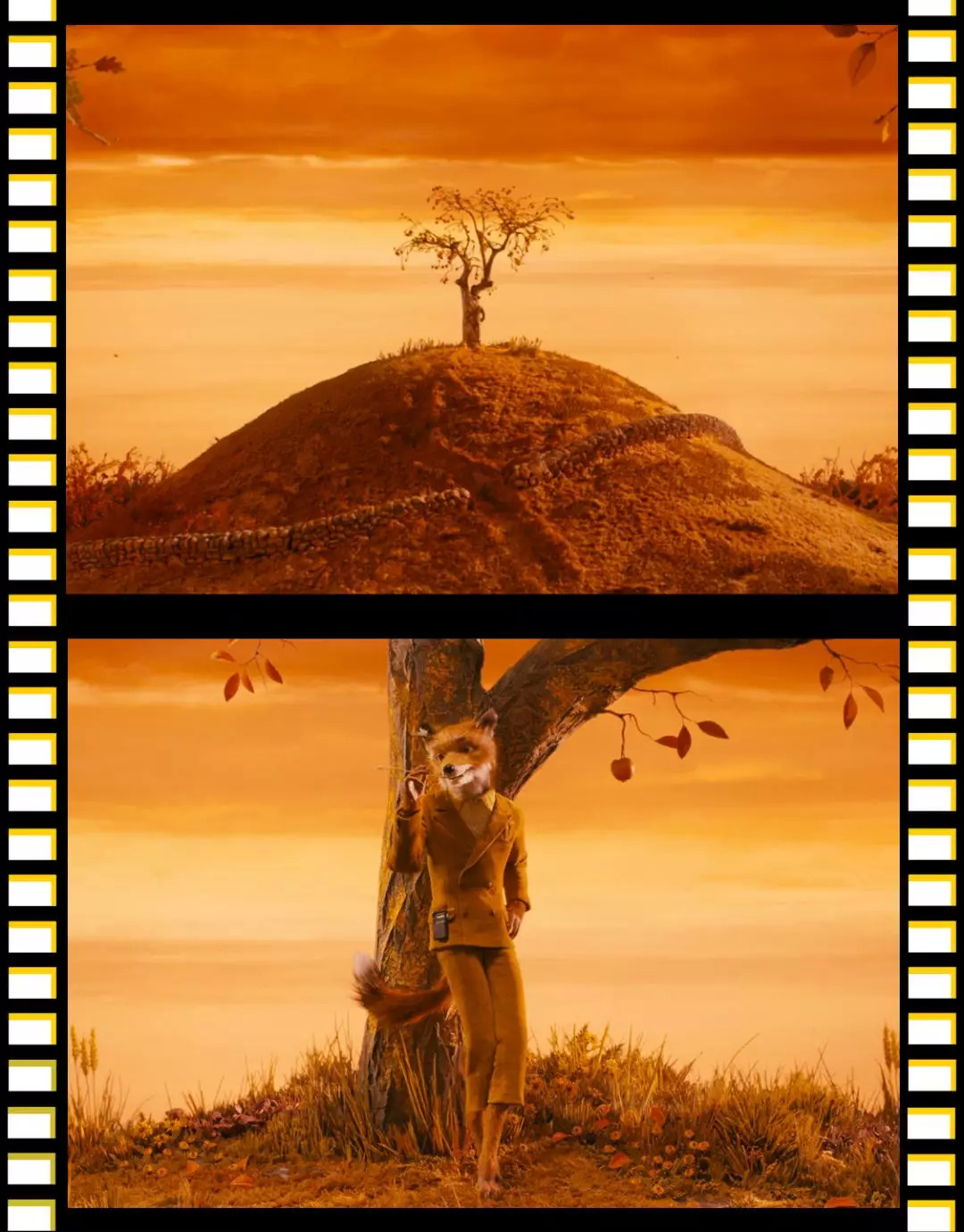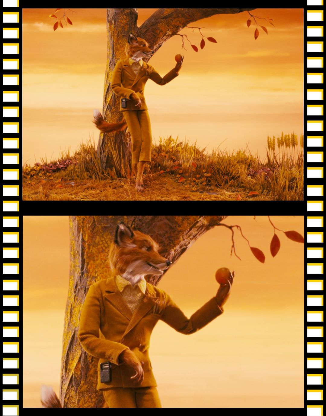 比如狐狸爸爸,刚出场的时候穿着这套黄色灯芯绒西装,倚在树上,背后是深深浅浅的黄,我当时就想,哇,狐狸都这么帅的吗。