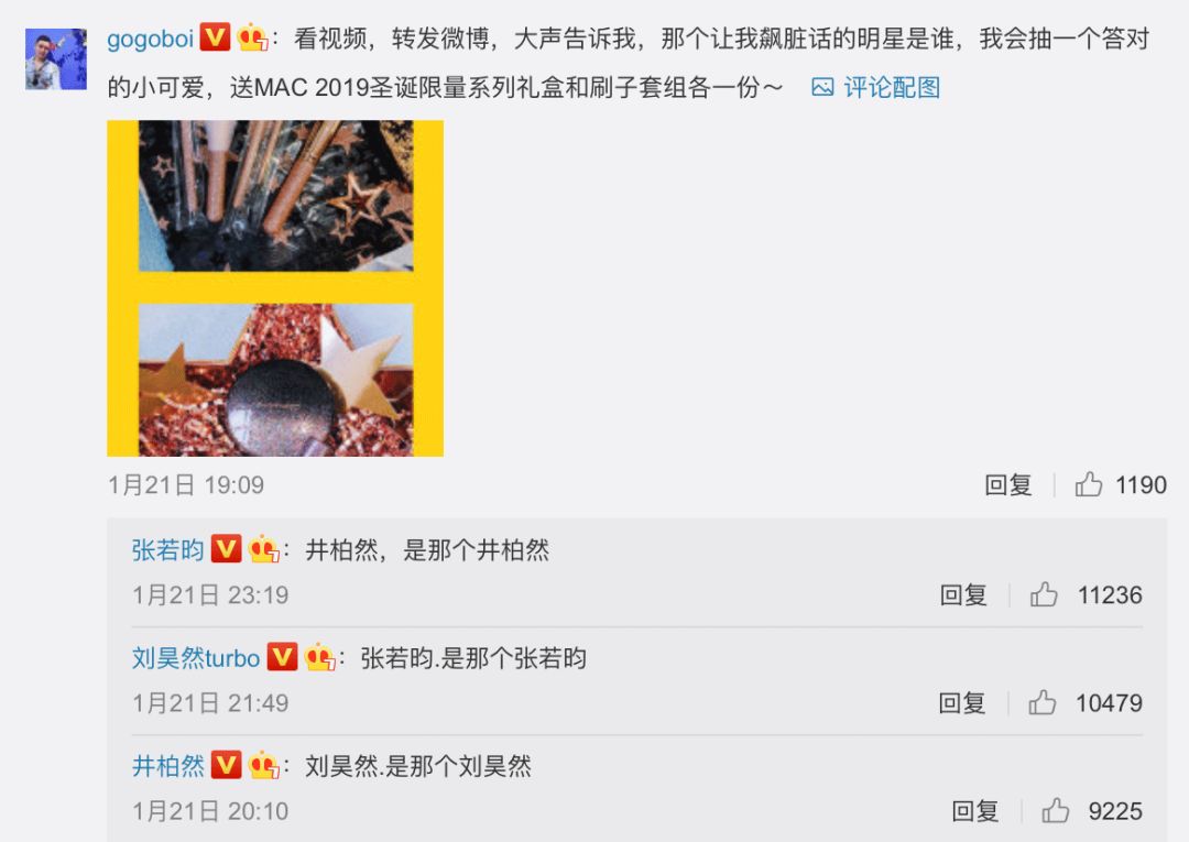 是那个让我在2019你说了算大奖颁奖礼上飙脏话,还曾为了要得到我的MAC礼盒,来我微博竞猜答题的井柏然吗?
