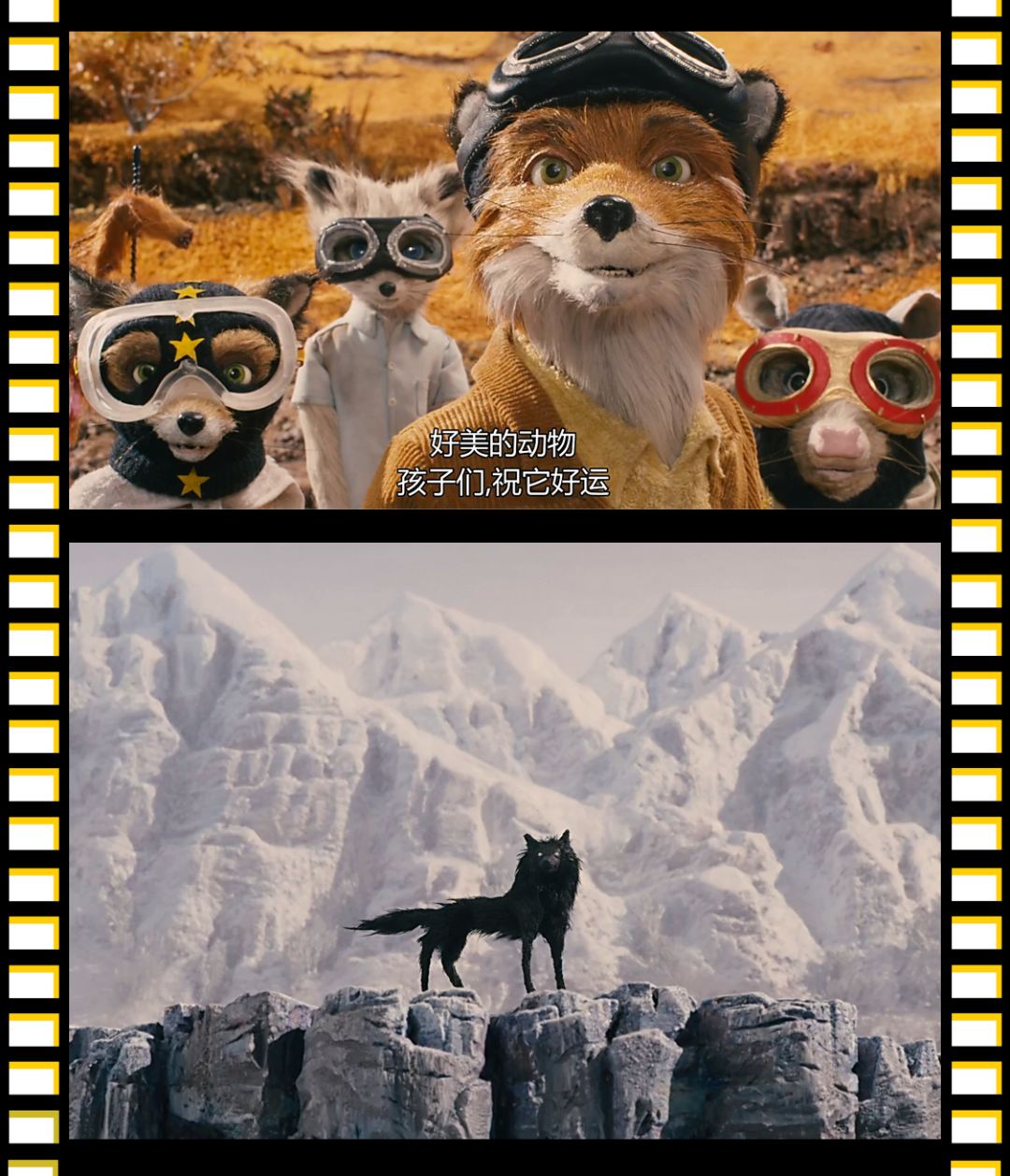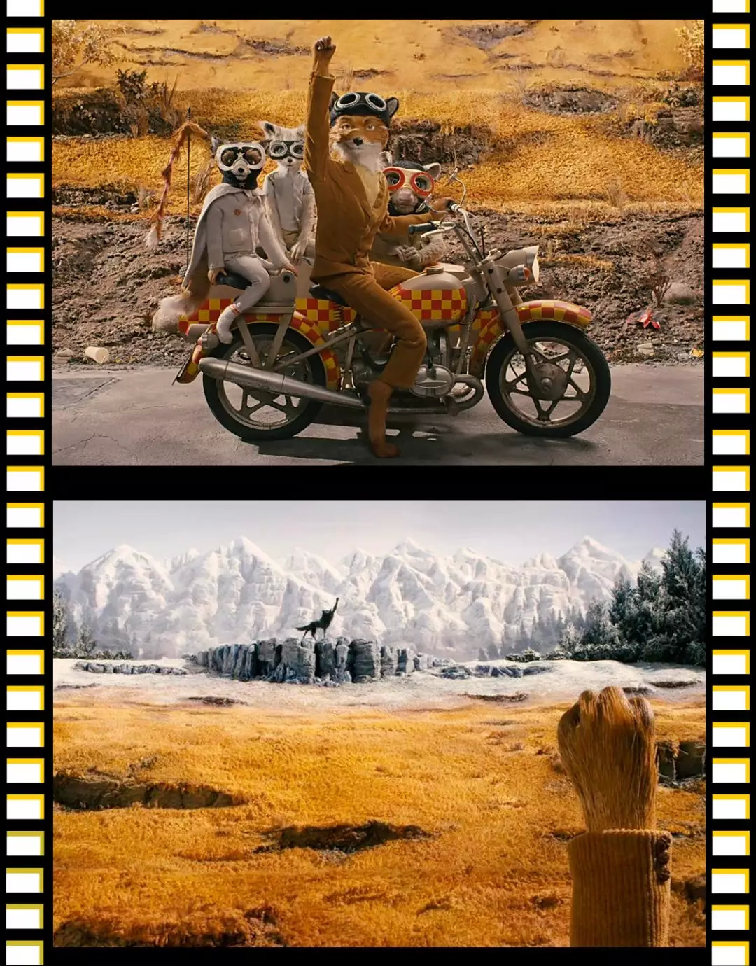 还有一个印象深刻的画面,就是狐狸爸爸开着车,半路突然停下来,和曾经害怕的狼举起手互相致意的时候。黄色的土地与远处的雪山相映,苍凉又美丽。自由又孤独。