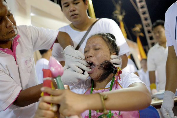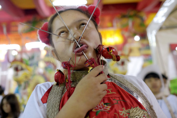 虔诚的信徒们会用金属等坚硬物体刺穿自己的脸颊,据说这样痛苦的行为能洗刷他们的罪孽。