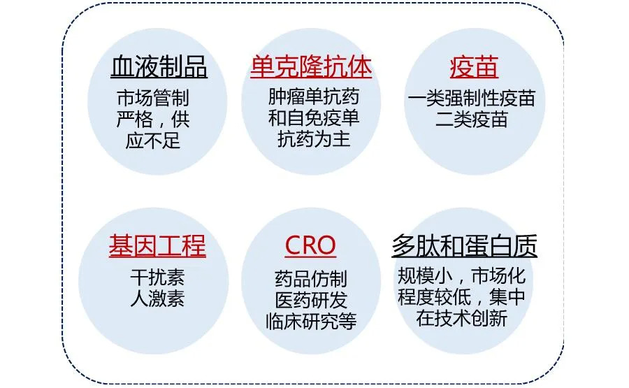 在前沿生物制药领域,血液制品、多肽和蛋白质药物发展势头相对不足,单抗药、新型疫苗、基因工程、CRO等领域快速发展。