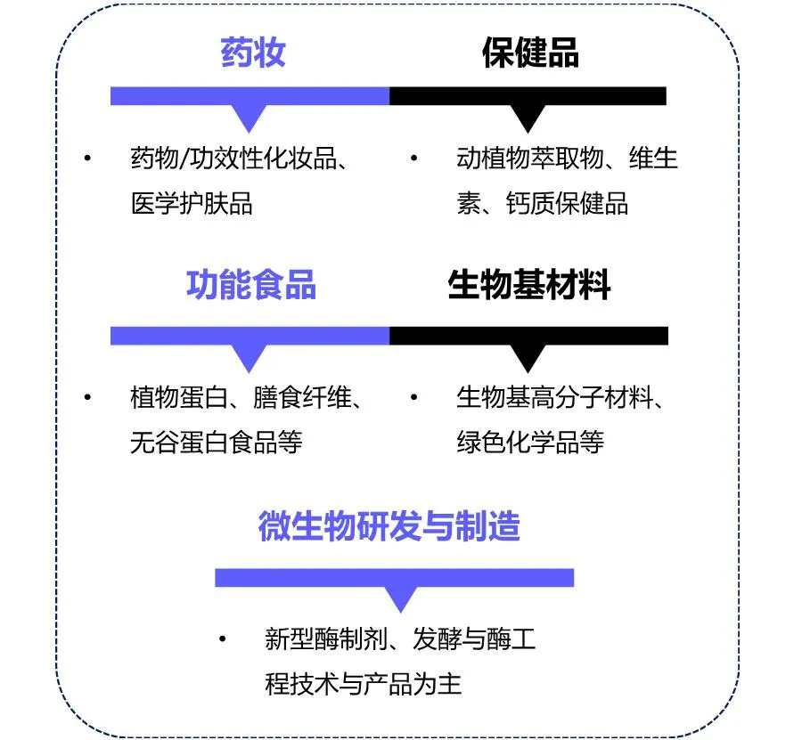 生物制造应用领域广,其中药妆、保健品、功能食品、生物基材料等产品领域潜力巨大。