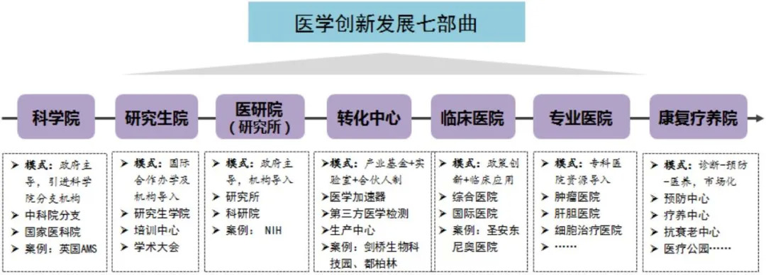 除了优良的创业创新环境,还必须建立起较为完善的生物医药创新链。生物医药创新链涵盖了“科学院-研究生院-医研院-转化中心-临床医院-专科医院-康复医院”整个医学创新闭环,除了倍受关注的科研院所、转化中心等环节,其中的医研院、临床医院、康复医院等环节对于生物医药创新也非常重要。日本静冈医药谷、美国长木医学区等创建全球一流的生物医药创新区,很大程度上得益于医药研发与医疗服务产业的联动发展,这为我国城市生物医药创新链建设提供了参考样板。