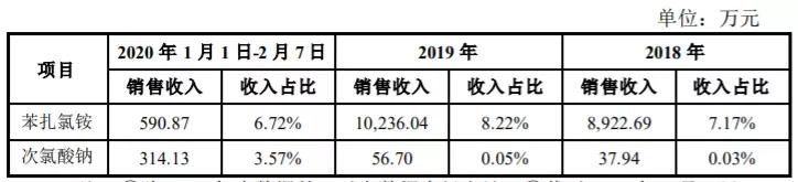 数据显示,在2019年,苯扎氯铵、次氯酸钠的销售收入分别为1.02亿元、56.7万元,收入占比分别为8.22%、0.05%,在2020年的1月1日至2月7日,两者的销售收入分别为590.84万元和315.13万元,收入占比分别为6.72%和3.57%。