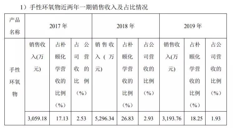 数据显示,2019年手性环氧物的销售收入为3193.76万元,仅占雅本化学营收的1.93%。尽管近三年的销售收入最高达到了5296.34万元,但其对应的比例也仅为2.93%。