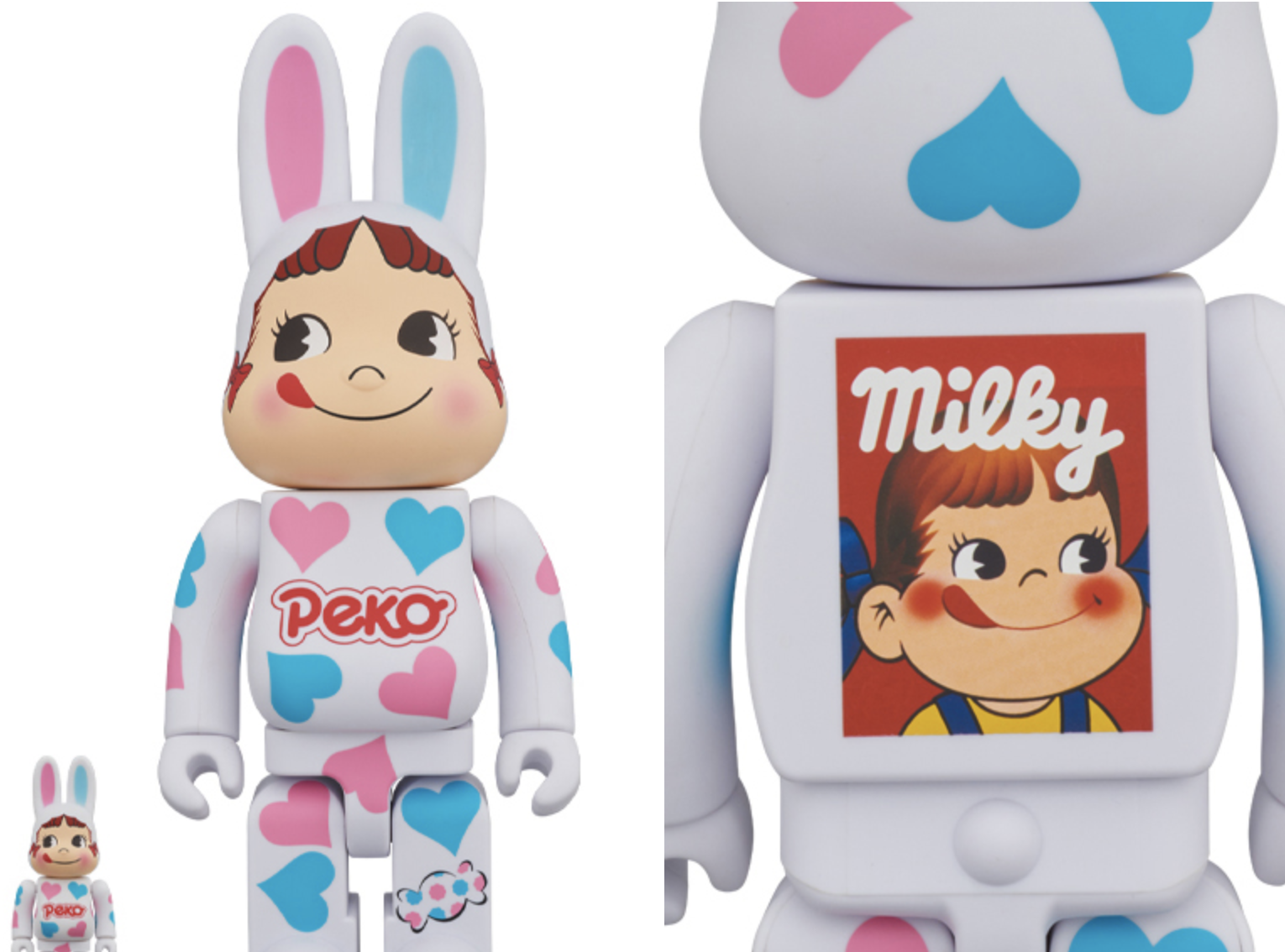 剩余两款玩偶的造型则十分契合即将到来的樱花季。在兔子玩偶中,PEKO全身被绘上了蓝色和粉色的爱心,并且腿上还画有糖果图案,带给人甜蜜的陪伴感。而在粉色玩偶中,PEKO除了换上樱花色调的吊带工装,还在头发上插入了颇具少女感的蝴蝶结,生动又活泼。