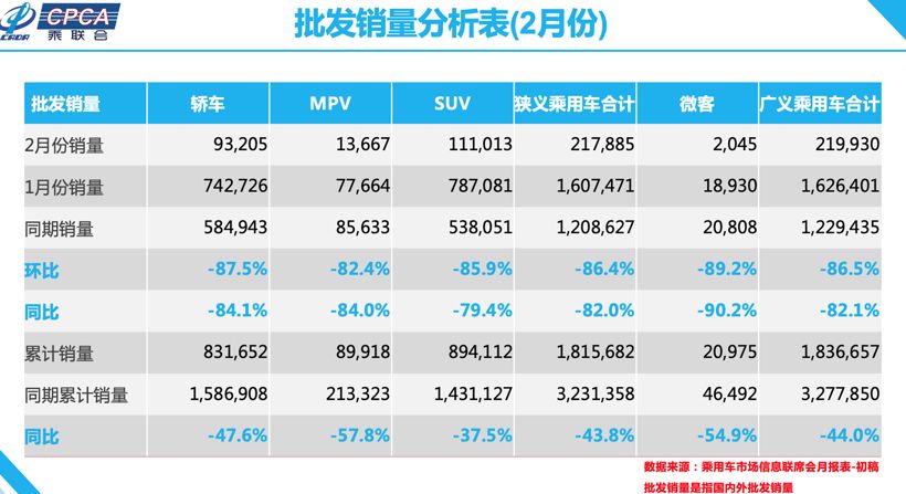 2月汽车市场的惨淡毫无悬念:乘用车销量22.2万辆,同比下降81.6%。一方面,受到疫情影响,人们的出行与消费被严重抑制,另一方面,车企从生产到销售的整个链条也严重受阻。