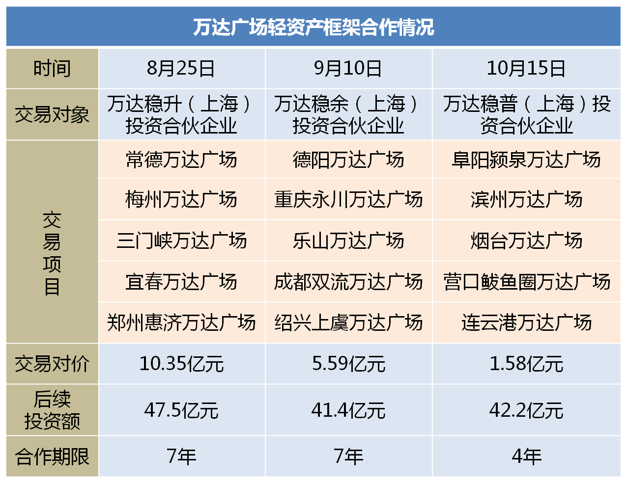 万达公告全称为“股权转让协议及轻资产合作框架协议”,这是万达正在大力推进的轻资产转型战略的必要环节。并且,这不是万达首次发布类似公告。早在8月25日,万达就已经开始与万达稳酬系列基金进行项目股权层面的转让,截至目前,已转让三笔,涉及15个项目。这三笔交易情况如下表——