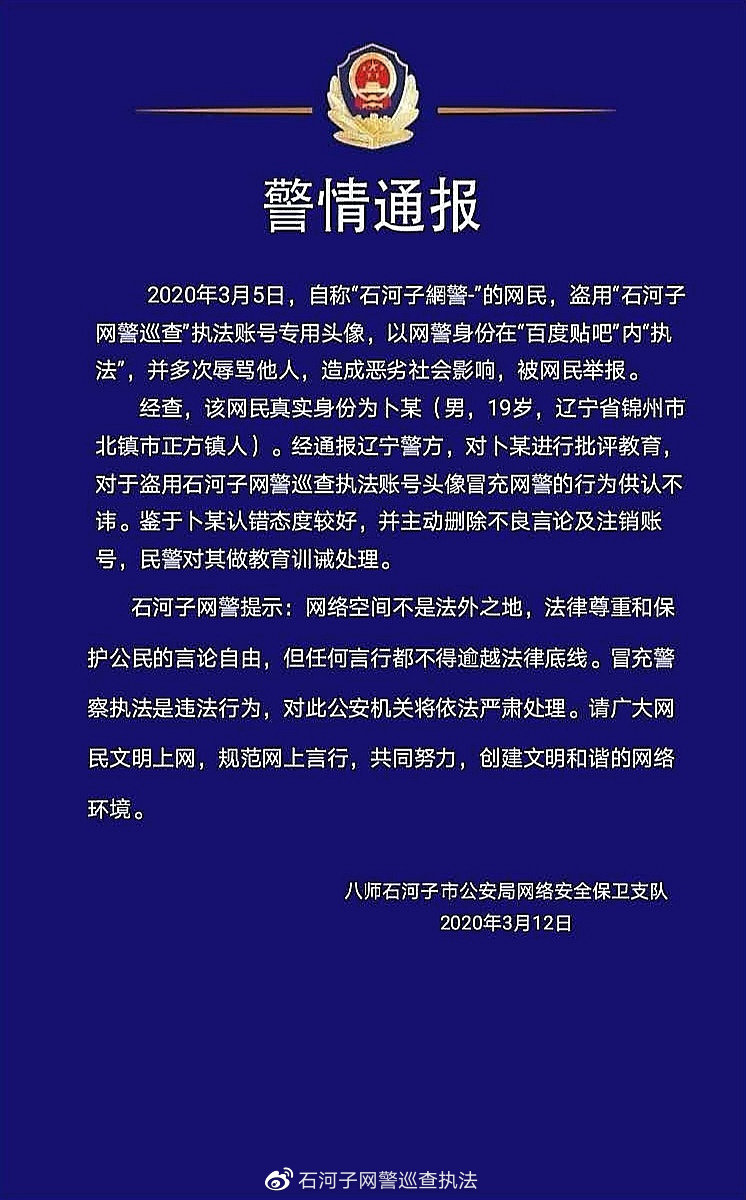 经查,该网民真实身份为卜某(男,19岁,辽宁省锦州市北镇市正方镇人)。经通报辽宁警方,对卜某进行批评教育,对于盗用石河子网警巡查执法账号头像冒充网警的行为供认不讳。鉴于卜某认错态度较好,并主动删除不良言论及注销账号,民警对其做教育训诫处理。