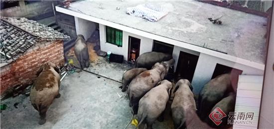 勐海县委宣传部相关负责人介绍,3月9日上午,14头野象从勐满镇进入到勐阿镇辖区,一直在树林里活动。3月11日晚,象群从山上下来到曼迈村委会曼倒、扎别村民小组附近活动,晚上8点左右,群象进入勐阿镇曼迈村委会扎别村民小组30号居民李云聪家中,造成家中石棉瓦顶、玉米、生活用具、酒坛(装有自烤酒)等不同程度损坏,但暂无人员伤亡。3月14日晚7点31分,9头野象进入黎明农场兴城社区第五居民小组王向东家中,造成太阳能、门、窗、玉米、水稻等不同程度损坏。