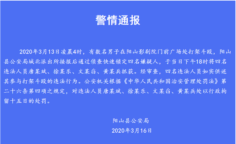 据广东清远市阳山县公安分局消息,2020年3月13日凌晨4时,有数名男子在阳山影剧院门前广场处打架斗殴,阳山县公安局城北派出所接报后通过侦查快速锁定四名嫌疑人,于当日下午18时将四名违法人员唐某斌、徐某乐、文某舀、黄某兵抓获。经审查,四名违法人员如实供述其参与打架斗殴的违法行为。公安机关根据《中华人民共和国治安管理处罚法》第二十六条第四项之规定,对违法人员唐某斌、徐某乐、文某舀、黄某兵处以行政拘留十五日的处罚。