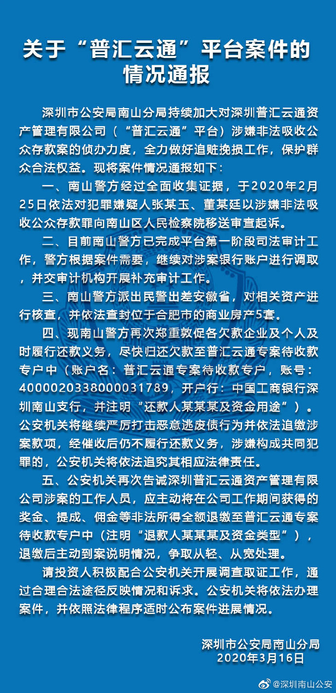 3月16日晚,深圳市公安局南山分局官方微博发布关于“普汇云通”平台案件的情况通报。南山警方经过全面收集证据,于2020年2月25日依法对犯罪嫌疑人张某玉、董某廷以涉嫌非法吸收公众存款罪向南山区人民检察院移送审查起诉。