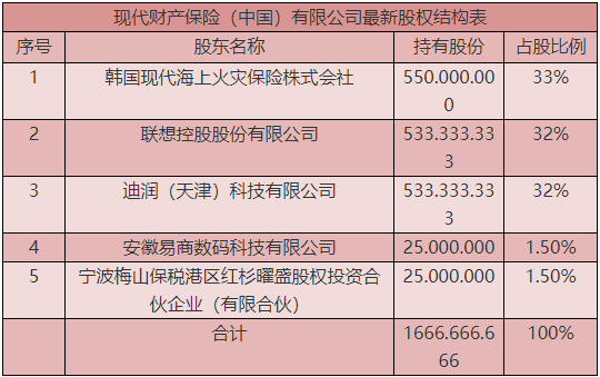 《每日财报》注意到,此轮增资扩股引入4家新股东,联想、滴滴系公司迪润科技,以及另两家法人股东。联想和迪润科技将各自持股32%,并列第二大股东,其他各占1.5%,原韩独资企业持股降至33%。至此,现代财险的性质也将由“外资”变为“中外合资”。