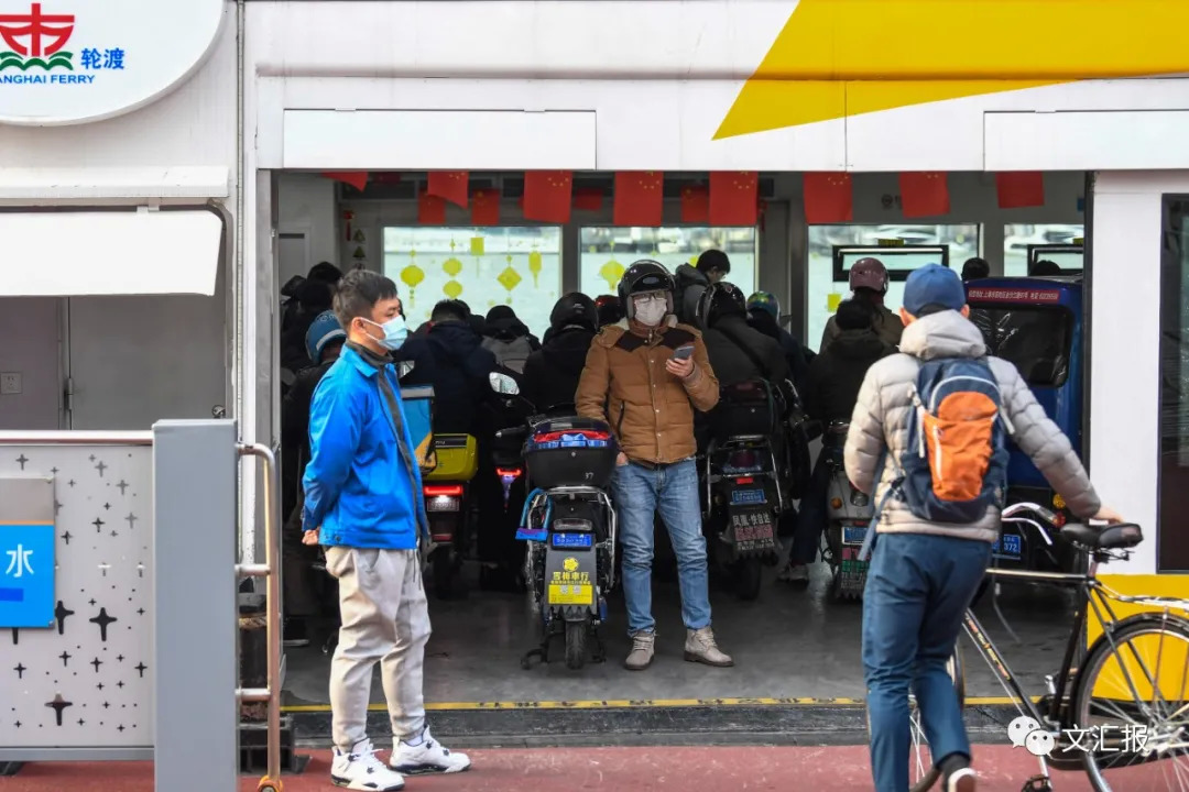 刚刚从建行下班的龙先生骑着电瓶车来到泰同栈渡口,他准备乘坐5点10分的那班船回家。受到疫情影响,原本上下班乘坐地铁的他,不得不改变出行方式。彼时,有将近30余人已经在浮桥上等待。不久后,船只准时抵达,一辆接着一辆电瓶车有序开入船舱内。