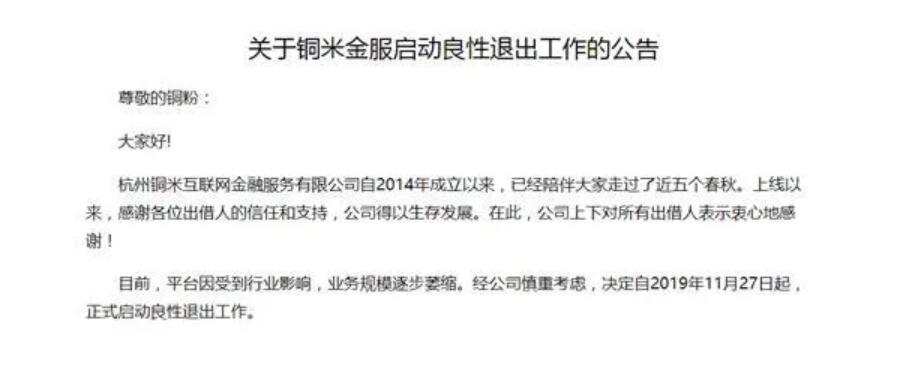 华夏能源网(www.hxny.com)注意到,在巨亏之下,铜掌柜于去年11月27日发布公告称,平台因受到行业影响,业务规模逐步萎缩。经公司慎重考虑,决定自即日起,正式启动良性退出工作。