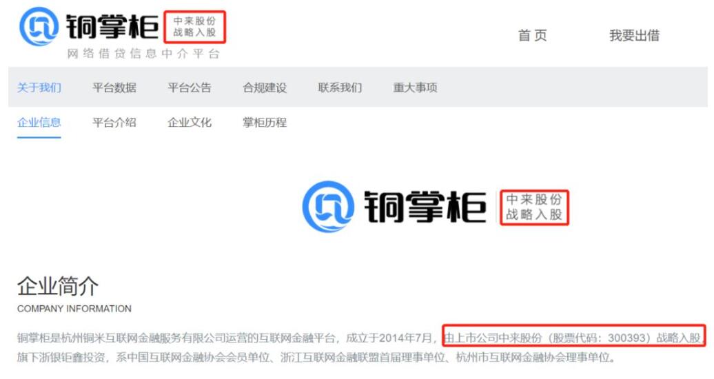 2015年,中来股份出资900万元参与铜米金融的天使轮融资,持有铜米金融27.55%股权,为公司第二大股东。而铜掌柜也对中来股份的战略入股引以为傲,在其官网首页及企业信息等多处标注此事。