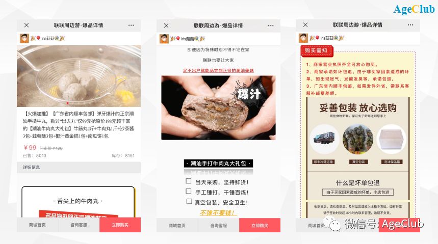 打开Y阿姨购买的“正宗潮汕手搥牛丸”商品链接,首先,商品详情页面使用了大量动图来证明牛丸的Q弹,还打出了“不弹不要钱”的宣传语;其次,留有详细的“购买须知”和客服微信电话,有效消除购买顾虑;