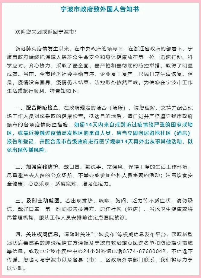 宁波市人民政府外事办公室发布《致外国人告知书》
