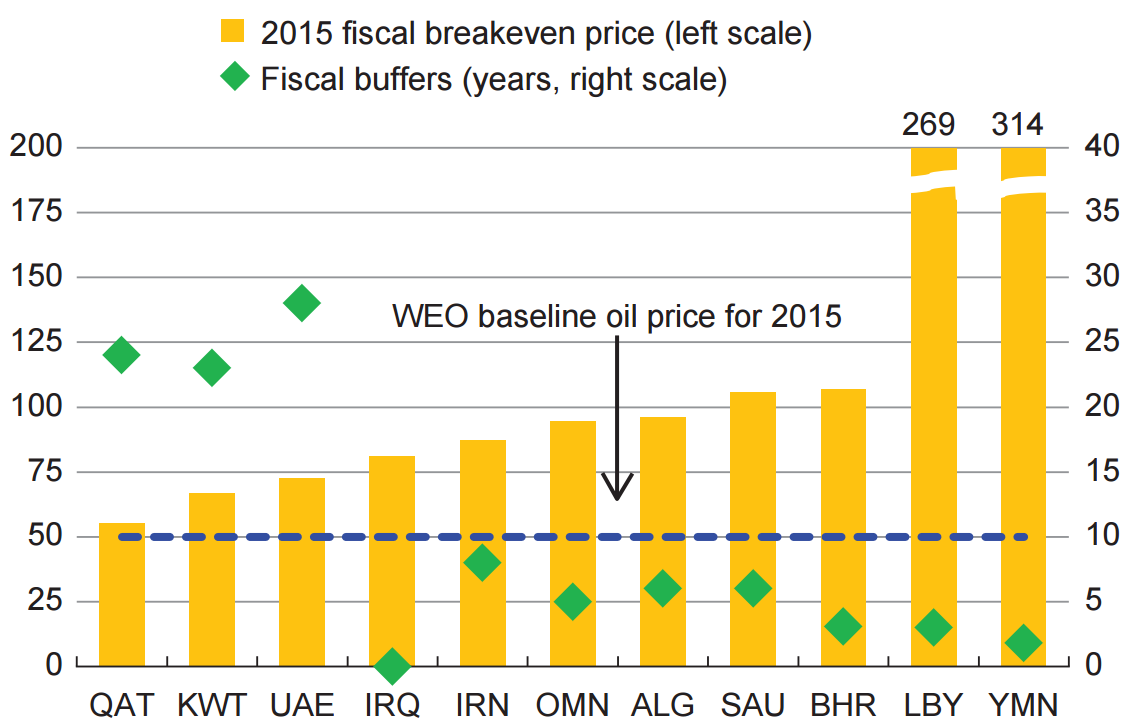 这是因为目前每桶石油的价格大大低于他们的“财政收支平衡点”(fiscal breakeven)——使政府预算达到平衡时的油价。