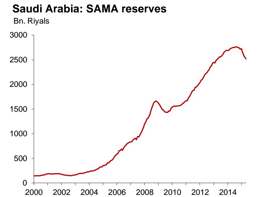 这是牛津经济研究院(Oxford Economics)最近统计的沙特外汇储备变化趋势: