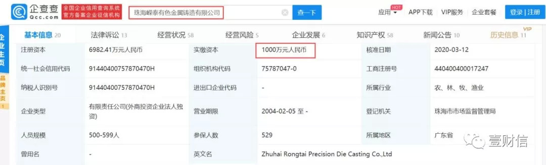 根据公开信息,珠海嵘泰成立于2004年2月5日,2018年3月7日,注册资本由1,000.00万元变更为6,982.41万元。《壹财信》查询企查查后发现,目前珠海嵘泰的实缴资本仍为1,000.00万元,澳门润成和景德镇科泰或在未实缴完整注册资本的情况下,参考注册资本6,982.41万元的价格转让所持股权给嵘泰工业。
