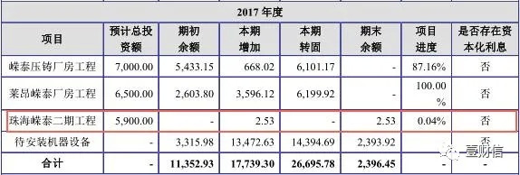 不过这也并不是编制招股书过程中出现的笔误,在分析嵘泰工业的在建工程科目时还发现,收购前的2017年,"珠海嵘泰二期工程"项目赫然出现在公司的在建工程列表中。