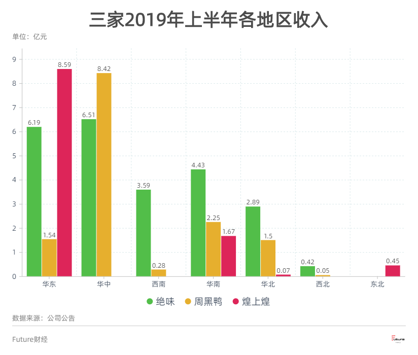而在2019年H1以前,周黑鸭一直以直营店为主,市场扩张态势缓慢,由上图可以看出,周黑鸭集中在华中地区(特别是武汉),而其余地区布局相对较少。