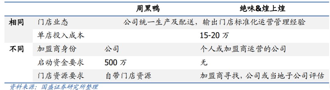 总的来说,绝味通过加盟模式实现了飞跃,周黑鸭、煌上煌相继开始改革。其中,周黑鸭开展高门槛的特许经营模式,相比仍旧缓慢的扩张是否卓有成效,还需时间验证;煌上煌重启扩张,同时仍在进行生产基地建设,供应链能力是其门店扩张的上限。