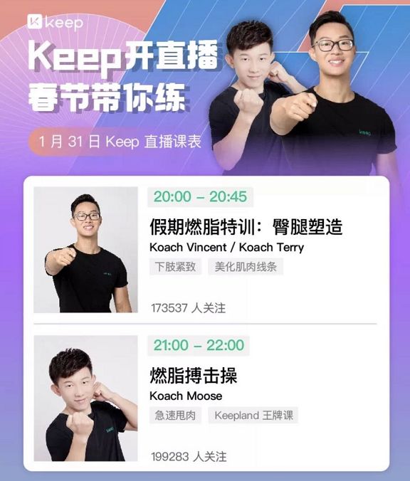 Keep原本的优势就是各类课程的整合与筛选能力。随着疫情爆发,Keep与趁早App、Shape 塑健身、每日瑜伽App ,lululemon等联手,以共享平台“假期运动直播大全”的方式,推出一系列整合健身课程。与超级猩猩一样,Keep也以“Keep君和他的朋友们”为名,在抖音开通账号定期直播。