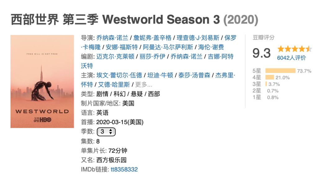 但不用担心,因为HBO的《西部世界》第三季回归了,片源告急的影迷们可放心收下这份“大补给”。作为HBO近3年来观众平均口碑最好的作品,《西部世界》凭借神转折的故事情节以及超过电影工业水准的制作得到了业内业外的广泛认可。