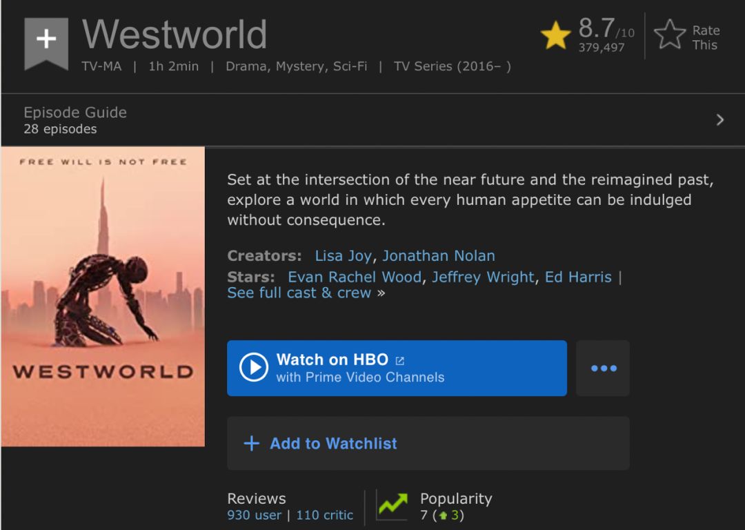 以上种种因素,使《西部世界》不得不火,因为它集齐了所有热门的条件。《西部世界》反映出的是HBO和好莱坞成熟的影视工业体系,而它也因此收获了足够的回报和赞美。