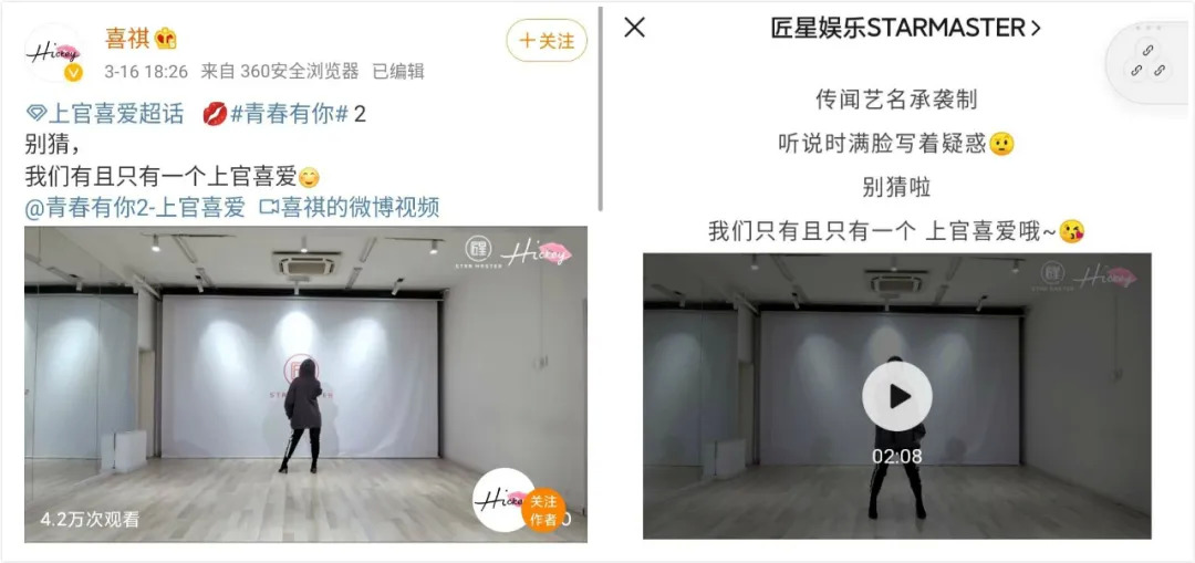 3月16日,上官喜爱所在组合官博@喜祺及匠星娱乐STARMASTER官方微信公众号回应,“别猜,我们有且只有一个上官喜爱。”