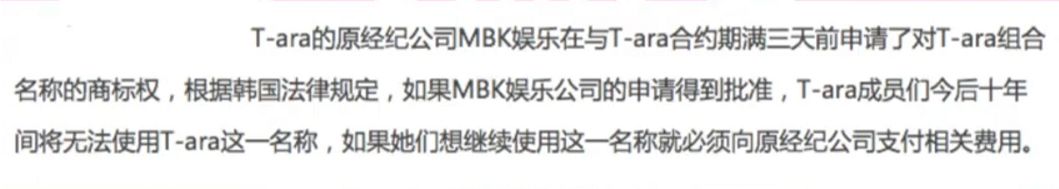 以韩团为例,据公开报道,2018年,T-ara在合约期满、脱离原经纪公司前三天,其经纪公司MBK娱乐申请了对T-ara组合名称的商标权,“根据韩国法律规定,如果MBK娱乐公司的申请得到批准,Tara成员们在今后十年间将无法使用T-ara这一名称进行公开活动。”