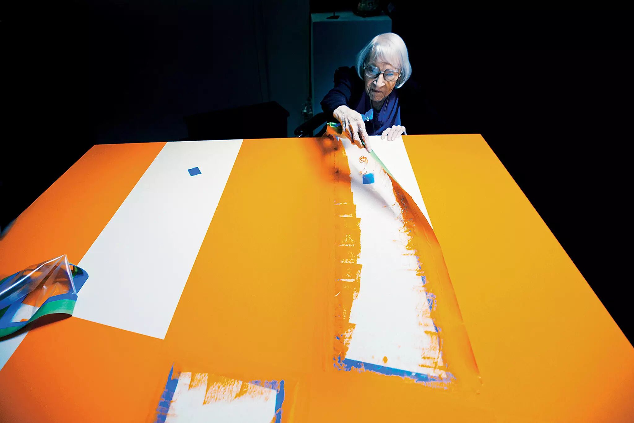 艺术家, 99岁(2015年100岁), 在她曼哈顿的工作室里。她在89岁的时候才卖掉自己的第一幅画,现在纽约现代美术馆和伦敦泰特美术馆都收藏有她的作品。