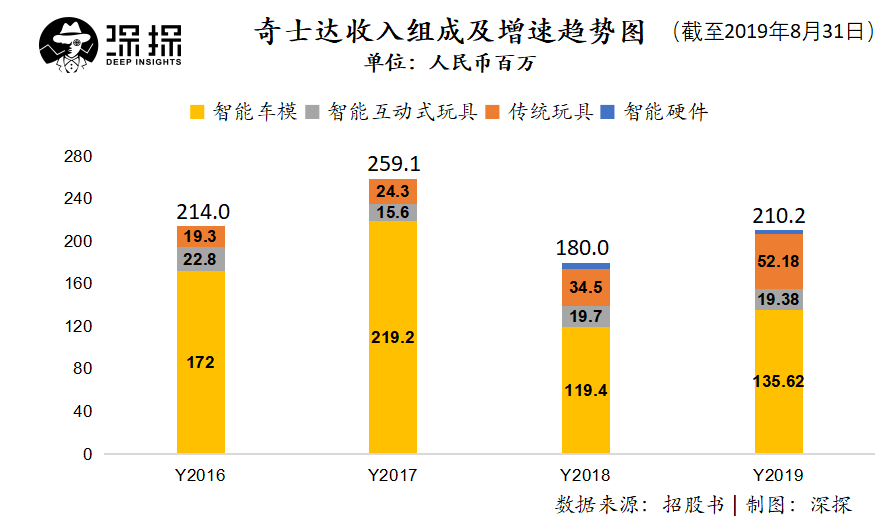 按照招股书数据,2016年至2019年8月21日,智能车模作为主营产品在收益中分别为1.72亿元、2.19亿元、2.18亿元、1.36亿元,分别占80.4%、 84.6%、78.3%、64.5%。智能互动式玩具分别收入2275.3万元、1555.5万元、1965.9万元、1938.1万元,占比分别为10.6%、 6.0%、7.0%、 9.2%。