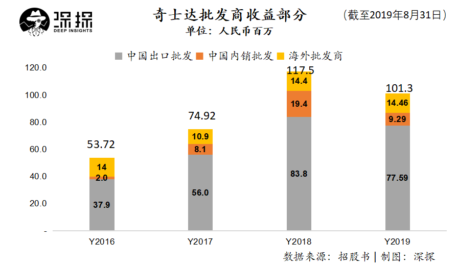 另外,奇士达还将产品出售给批发商,其中中国出口型批发商近年来增长迅速,收入从2016年的3787万元增至2018年的8376万元,收入占比从17.7%提升至30.1%。内销型批发也有所缓进。