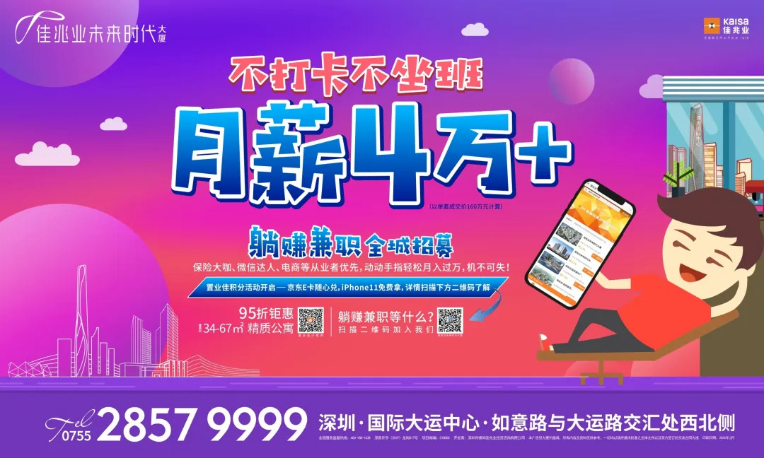 低投入、较高回报是所有人的愿景。佳兆业未来时代大厦全城招募,重磅推出“置业佳”躺着赚钱的兼职。以不打卡不坐班、不占用主业工作时间、低风险、无门槛的优势远胜其它副业,而且,“置业佳”不管你是否有销售经验、买不买房,只要推荐邀请好友,动动手指就能坐享收益。