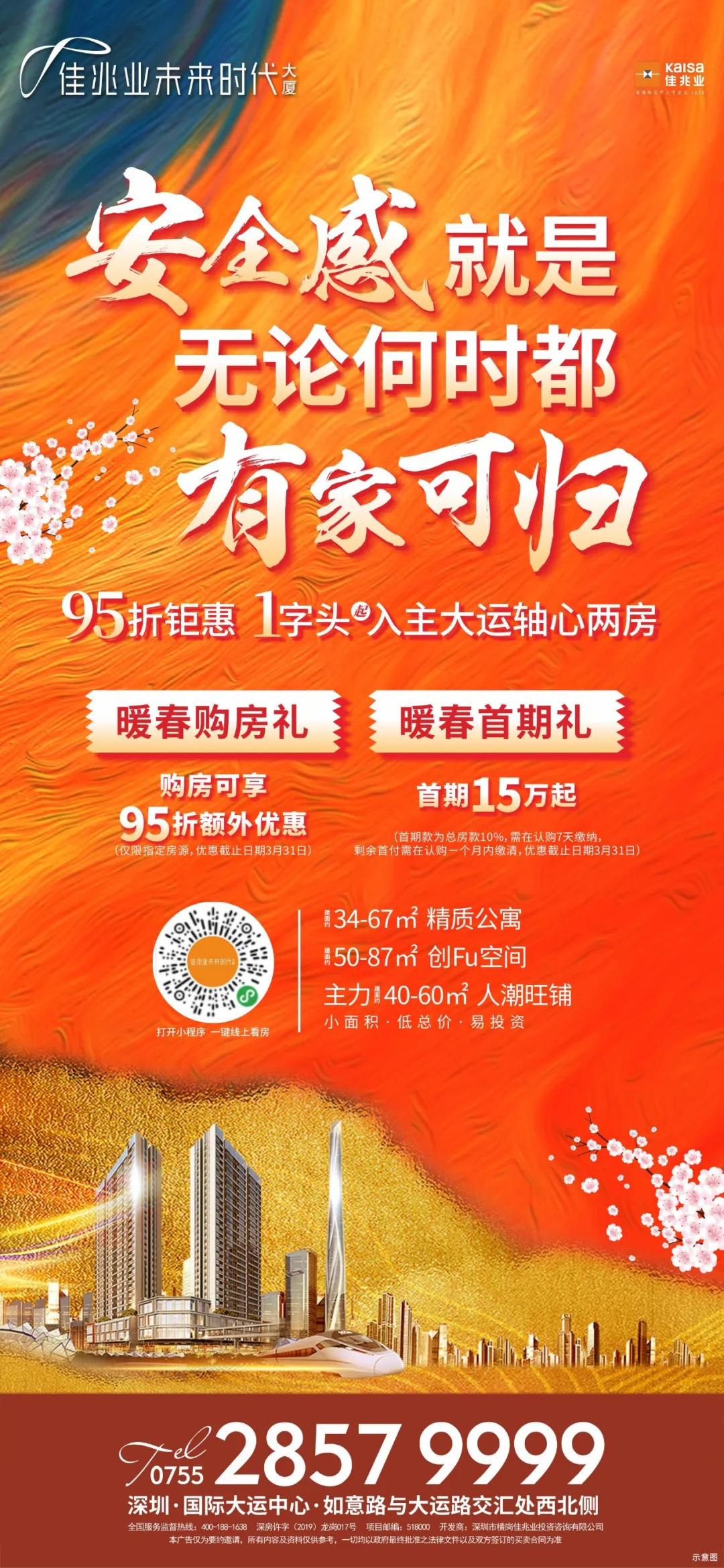 佳兆业未来时代大厦建面约61-67㎡精质公寓,首期15万起(认购7天内缴纳总房款的10%,剩余首付款在认购一个月内缴清),95折钜惠倒计时中(指定房源),一字头即可入主大运轴心两房,瑧装奢配,低总价、低门槛,较高性价比。同时,项目携手途趣酒店推出“无忧托管服务”,坐享6000+月租收益(该数据为预测收益峰值,不作固定收益承诺),钱程万里,争藏从速,错过不再!