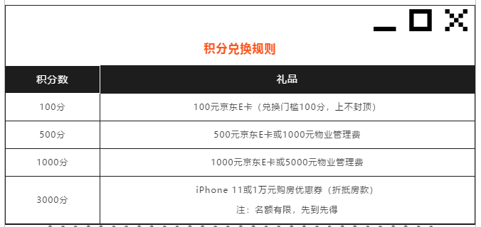 除此之外,佳兆业未来时代大厦还推行多重积分兑换壕礼的活动,详情请见文尾“积分得壕礼细则”以及“积分兑换规则”。同时,项目为特别感谢业主朋友们的大力支持,实行500积分兑换1000元物业管理费、1000积分兑换5000元物业管理费机制,业主入住之后可直接使用,当然亦可兑换iPhone11、京东E卡等多重壕礼。机会难得,还在等什么?!