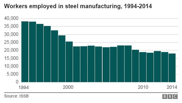 在1970年代,二十多万人就业于英国的钢铁行业,但目前还不到两万。工会说,1/6的工作岗位都不稳定。