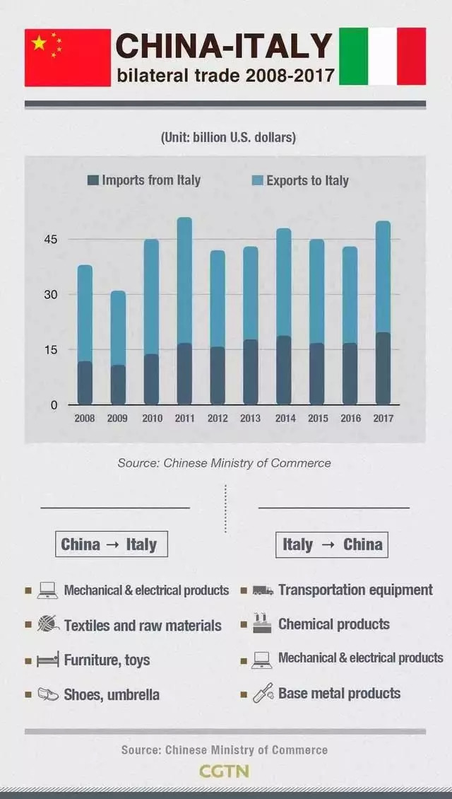 数据显示,自1970年两国建交以来,中意之间贸易额从最初的1.08亿美元增长到2018年超过500亿美元,双向投资额接近200亿美元。
