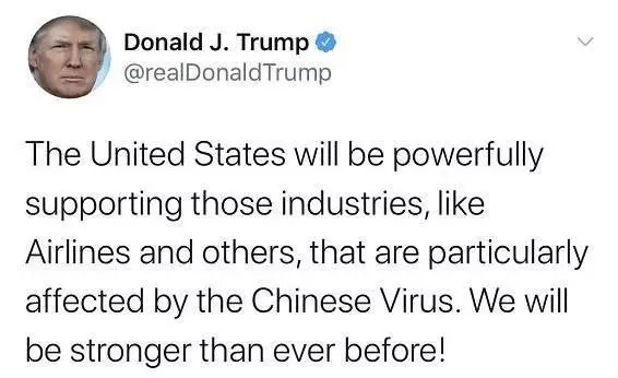 3月16日,特朗普在推特上发文称新冠病毒为“中国病毒”。