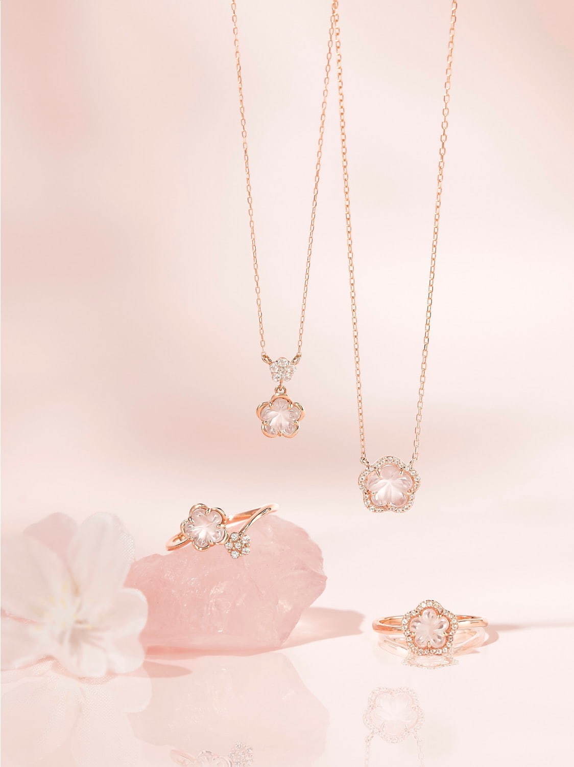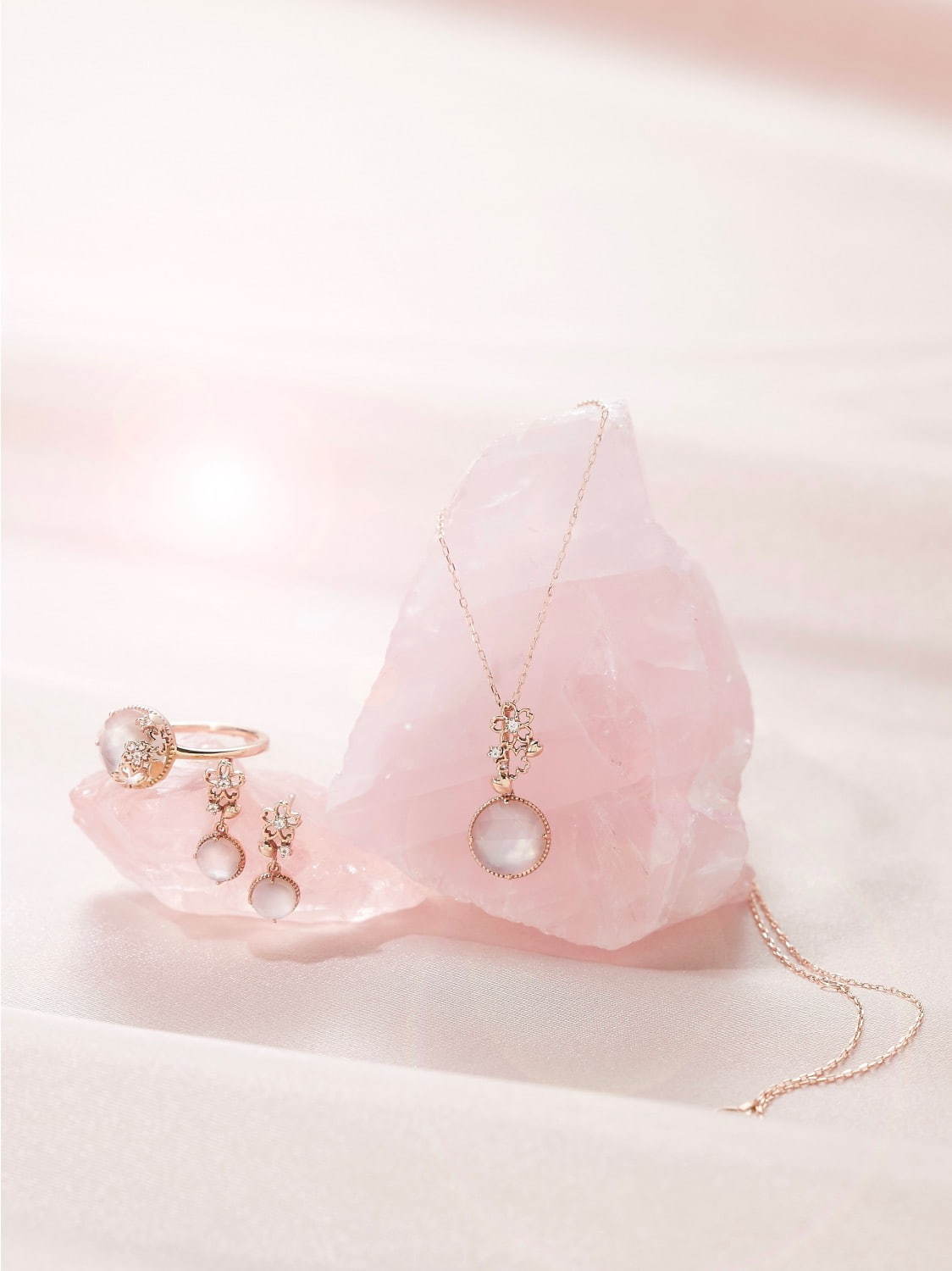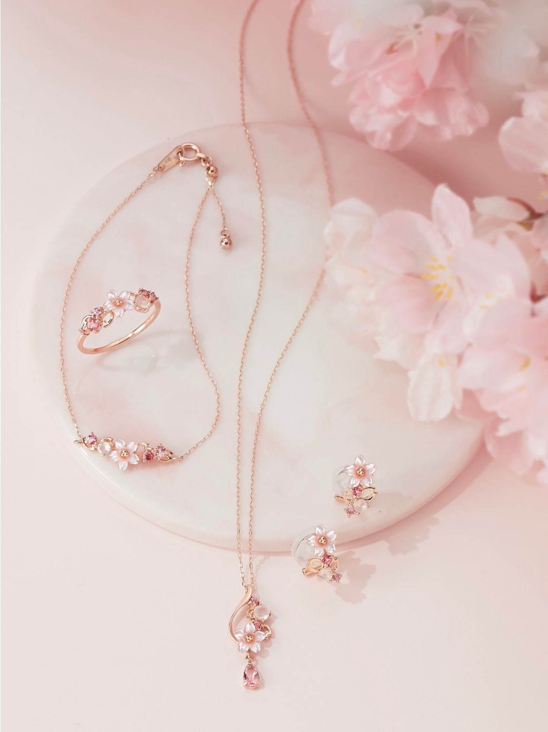 作为当下在社交媒体上最为火热的日系珠宝品牌之一,要是Samantha Tiara不在春日推出樱花系列,那只能有两个原因:Samantha Tiara倒闭了或樱花树灭绝了。在即将发售的春季限定珠宝里,Samantha Tiara从色彩和外观两个层面来展现樱花的娇柔美感。带有温润光泽的浅粉色蔷薇石英被与玫瑰金色链条搭配,散发出清淡温婉的光芒。