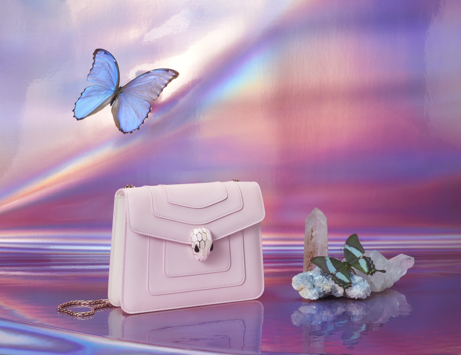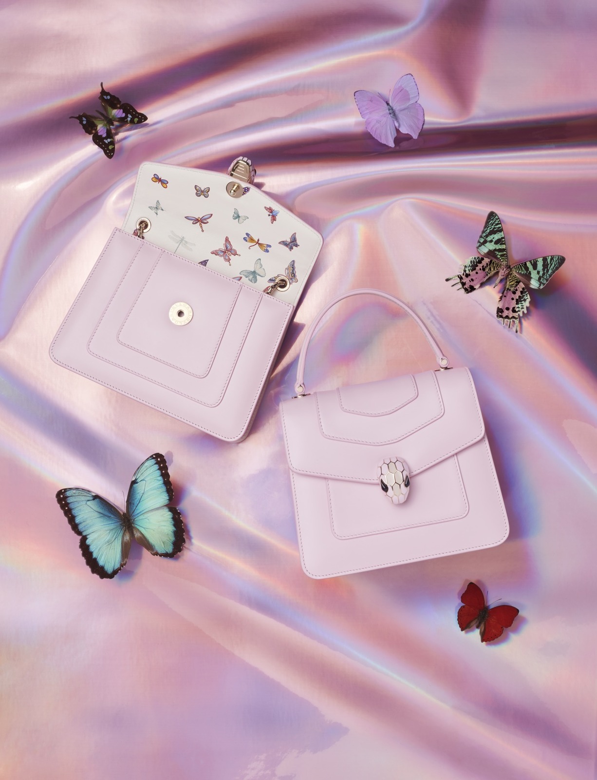 也许是因为同属一家母公司的缘故,BVLGARI跟Fendi一样,选择将自己家最为经典的Serpenti包袋进行再创作。相较于以往Serpenti包袋展现出了危险蛇蝎美人形象,此番BVLGARI选择用浅粉紫皮革来迎合樱花的温柔形象,并且在包袋内侧描绘了一副彩蝶纷飞的图景,带有着浓郁的东方风格。
